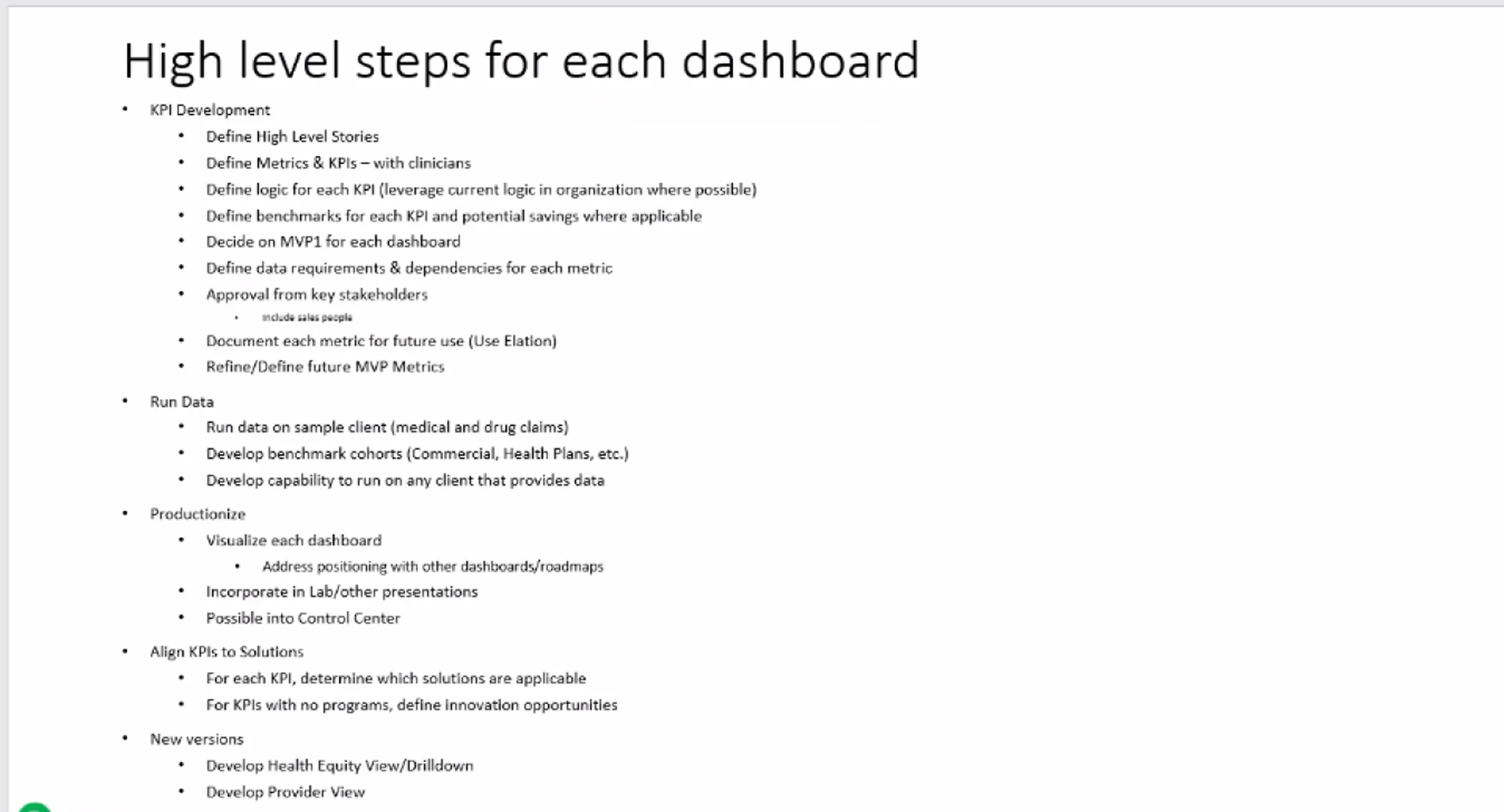 Before launching the final Oncology dashboard, we moved through a series of development phases that combined stakeholder input, data validation, and iterative design. Each phase helped refine how we visualized cancer burden, disparities, site-of-care insights, and treatment dynamics.