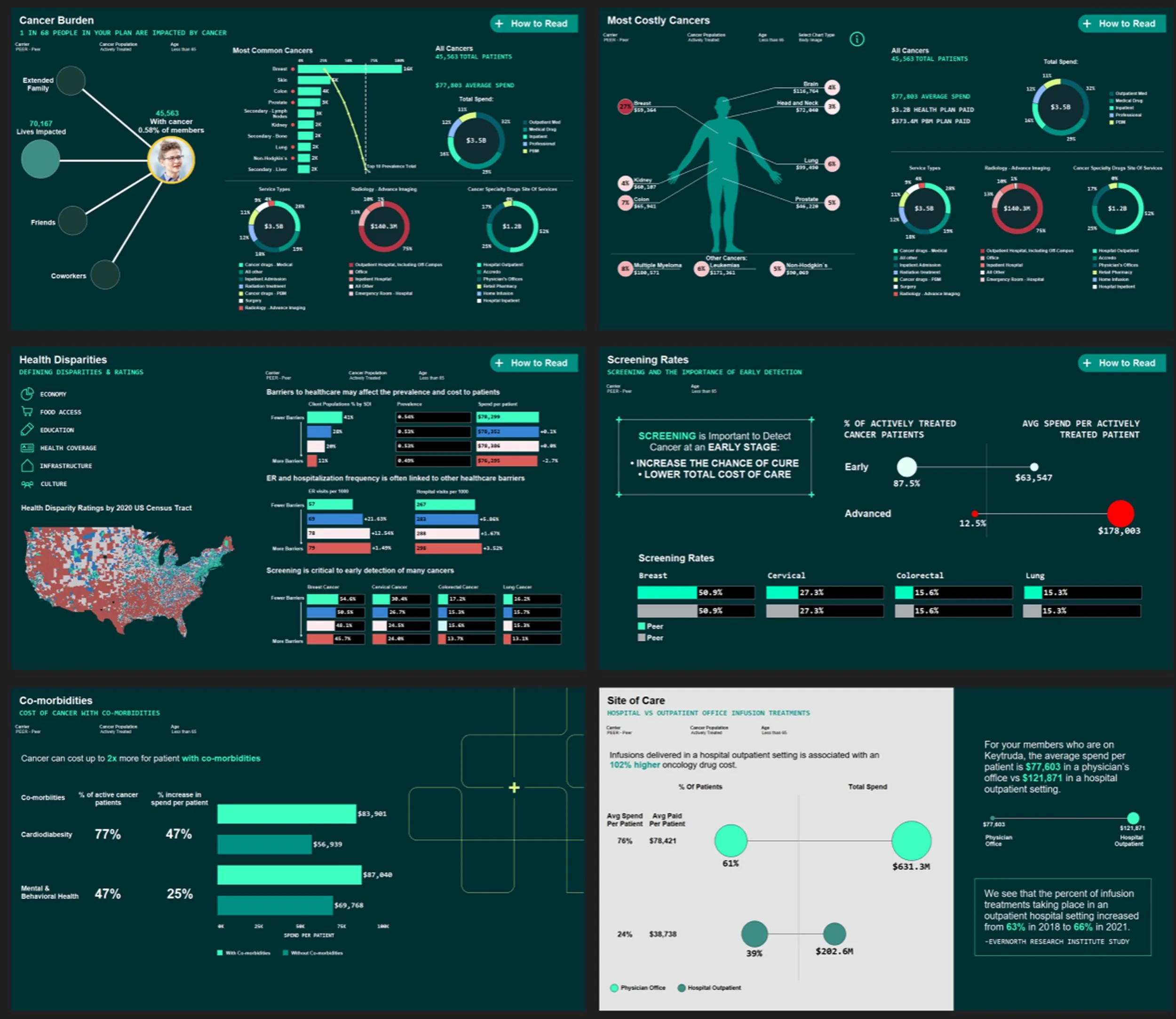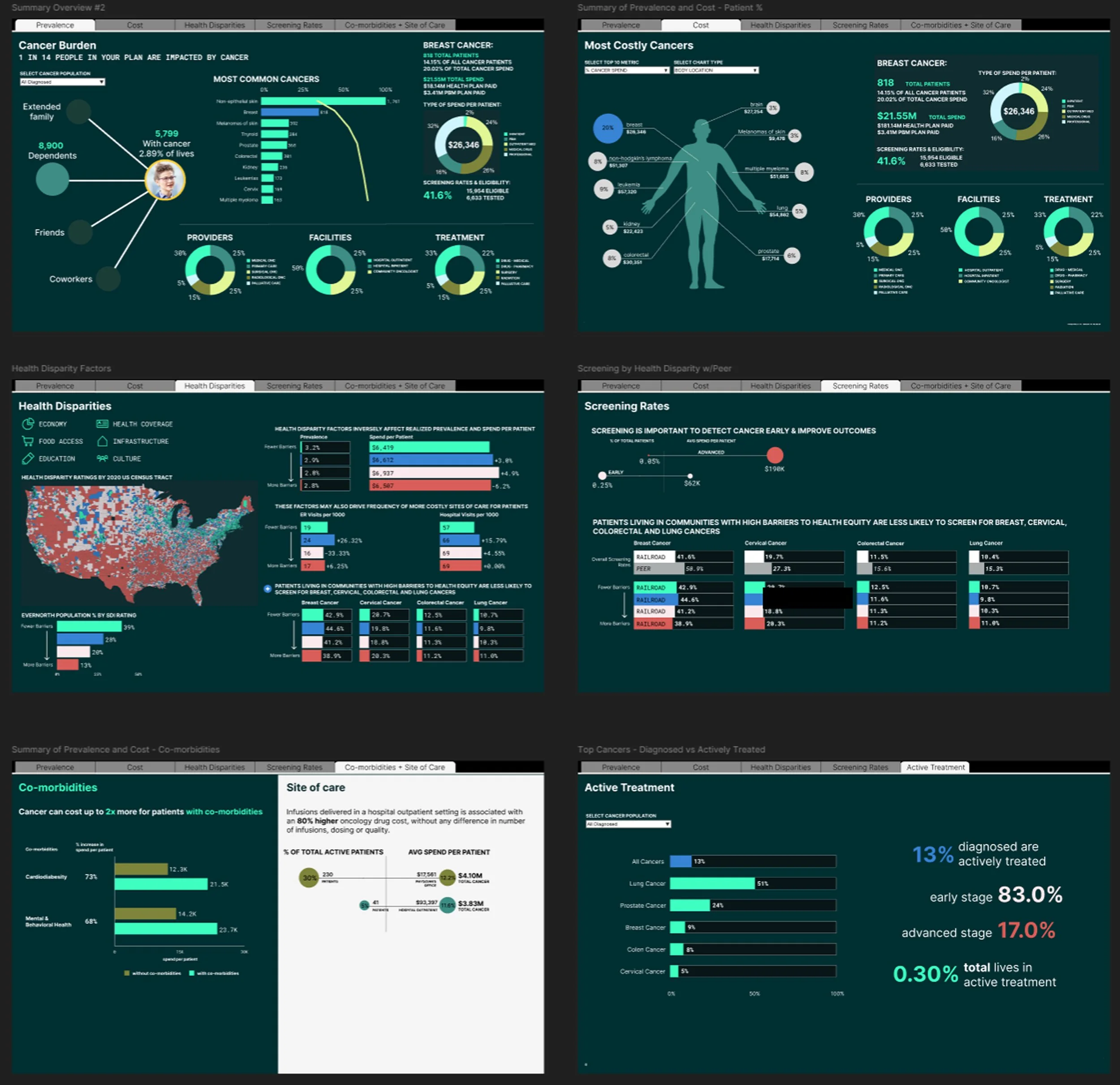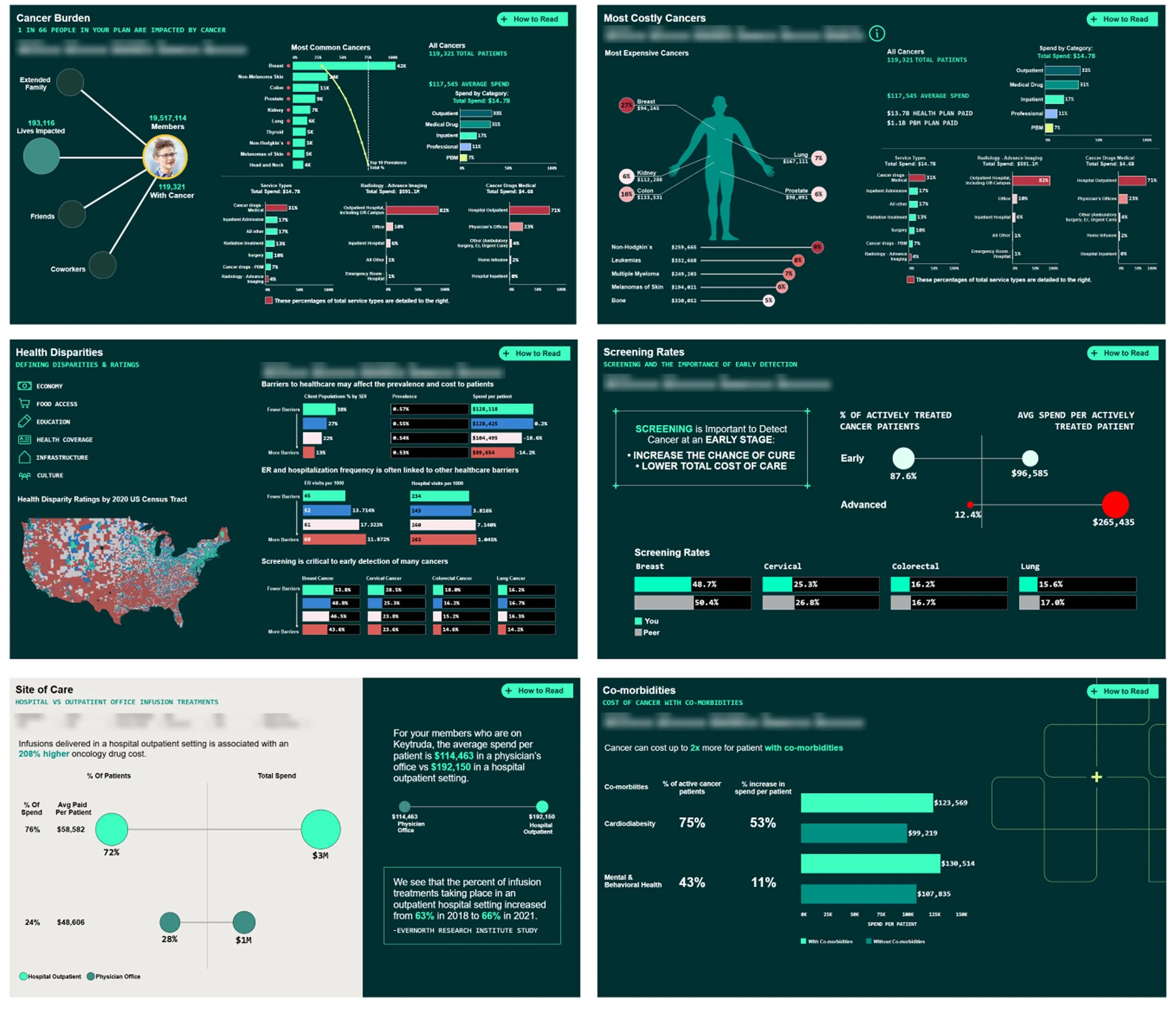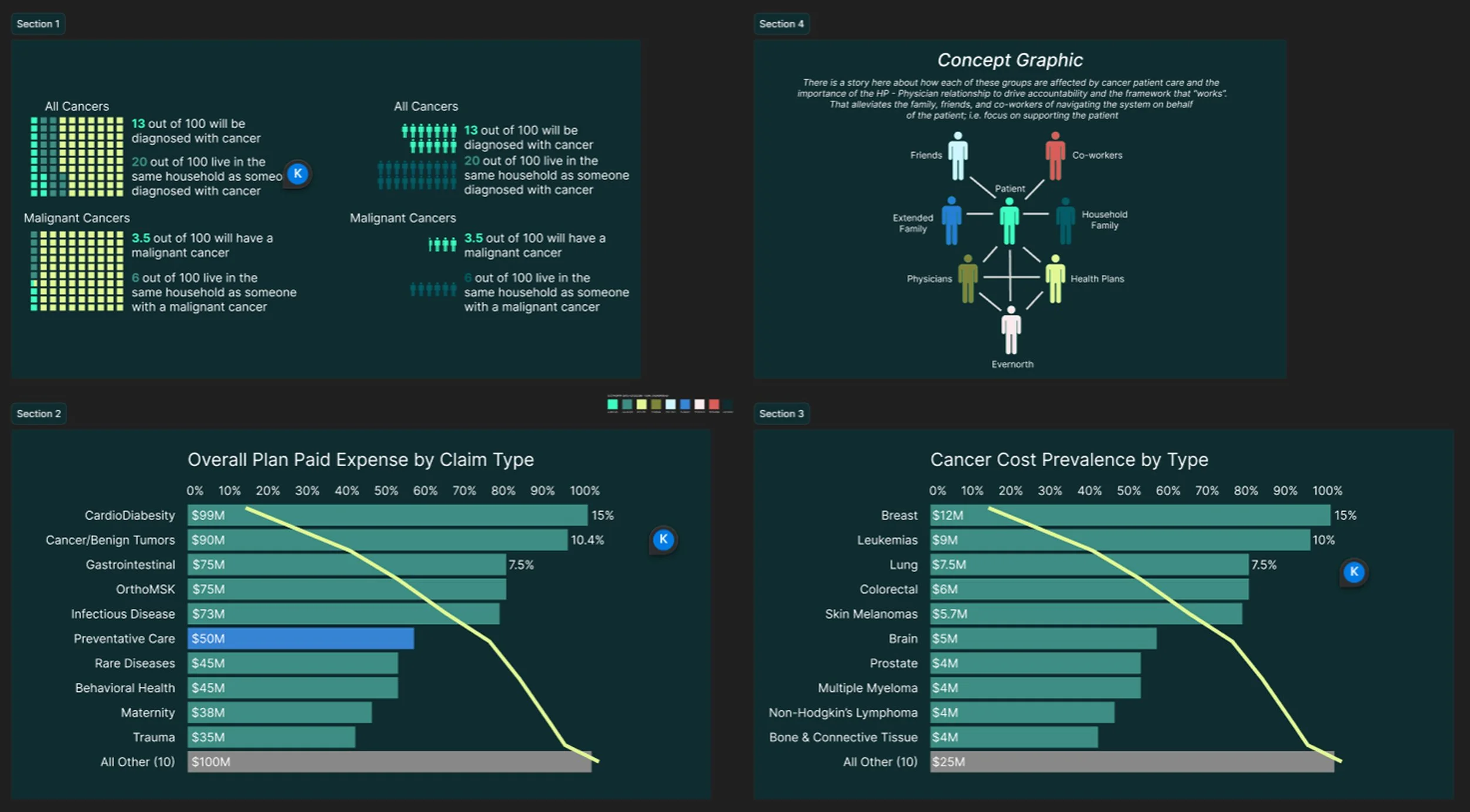 Before finalizing the Oncology dashboard, multiple design iterations were created in Figma to explore how best to translate complex cancer and claims data into an intuitive, visually engaging experience. Each version tested different layout structures, visual hierarchies, and storytelling approaches to refine clarity, highlight key metrics, and align with stakeholder priorities.